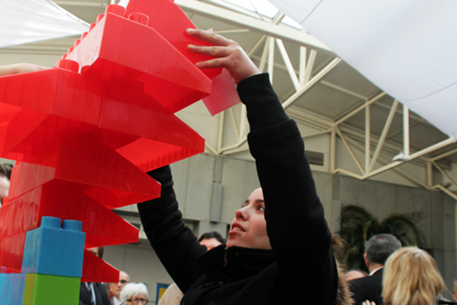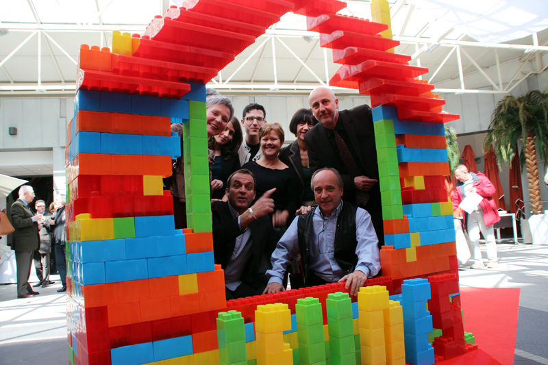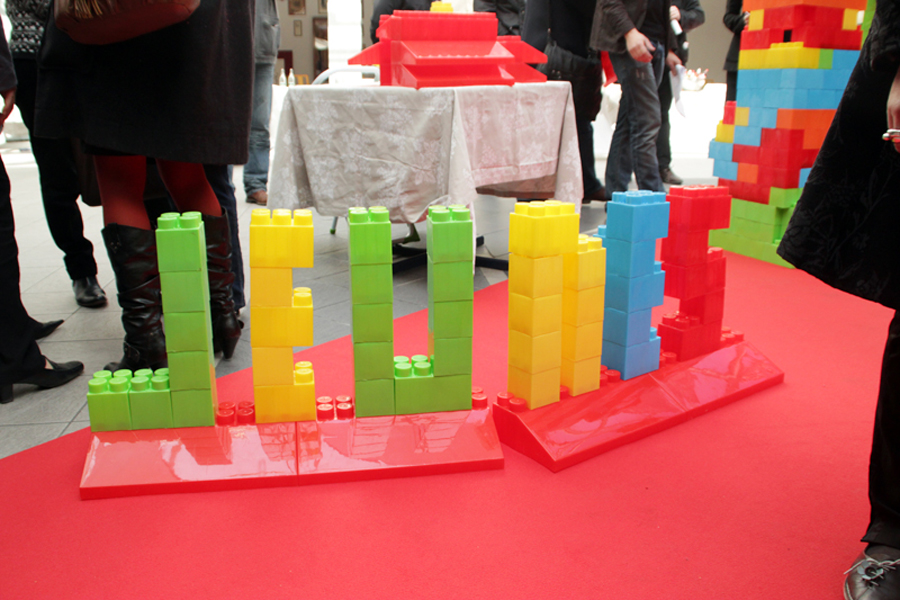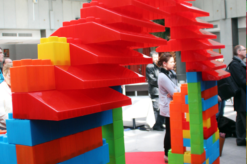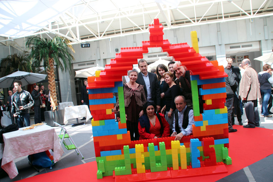 maison en « légo » géante, mise en scène des interventions, installation sur site.